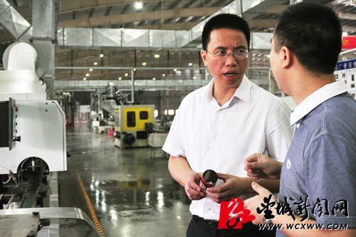 望城区委副书记、区长孔玉成(左)正在了解企业生产情况。高亮 摄