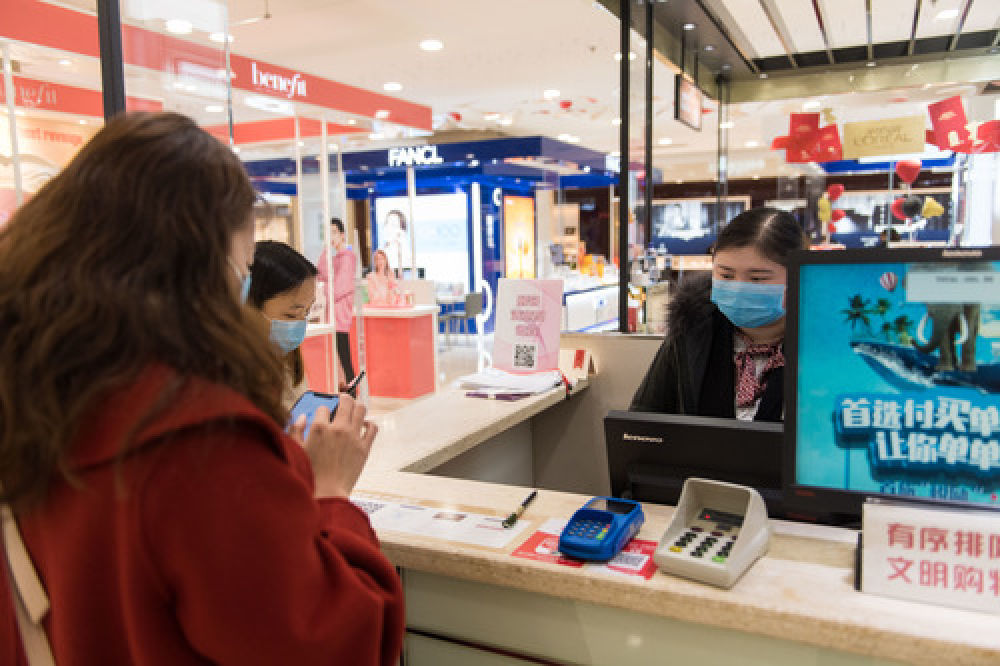 2月10日,在长沙王府井百货商场,消费者在收银台买单。 新华社发(陈思汗摄)