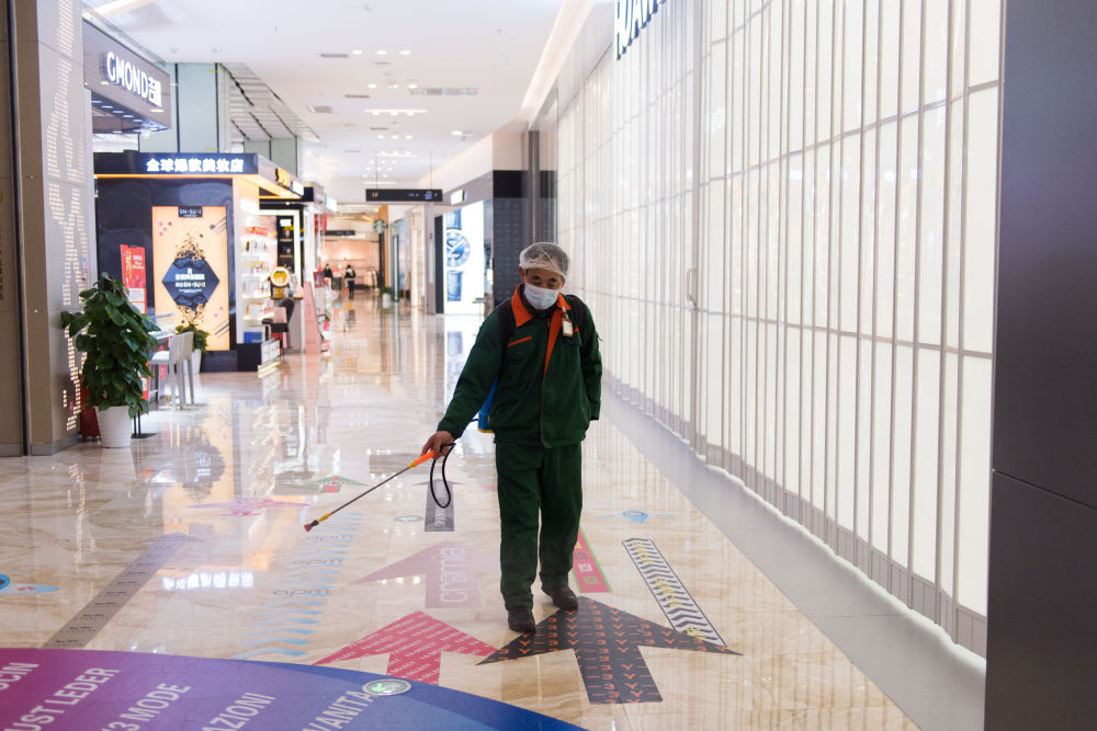 2月10日,在长沙王府井百货商场,工作人员在店铺内消毒。 新华社发(陈思汗摄)