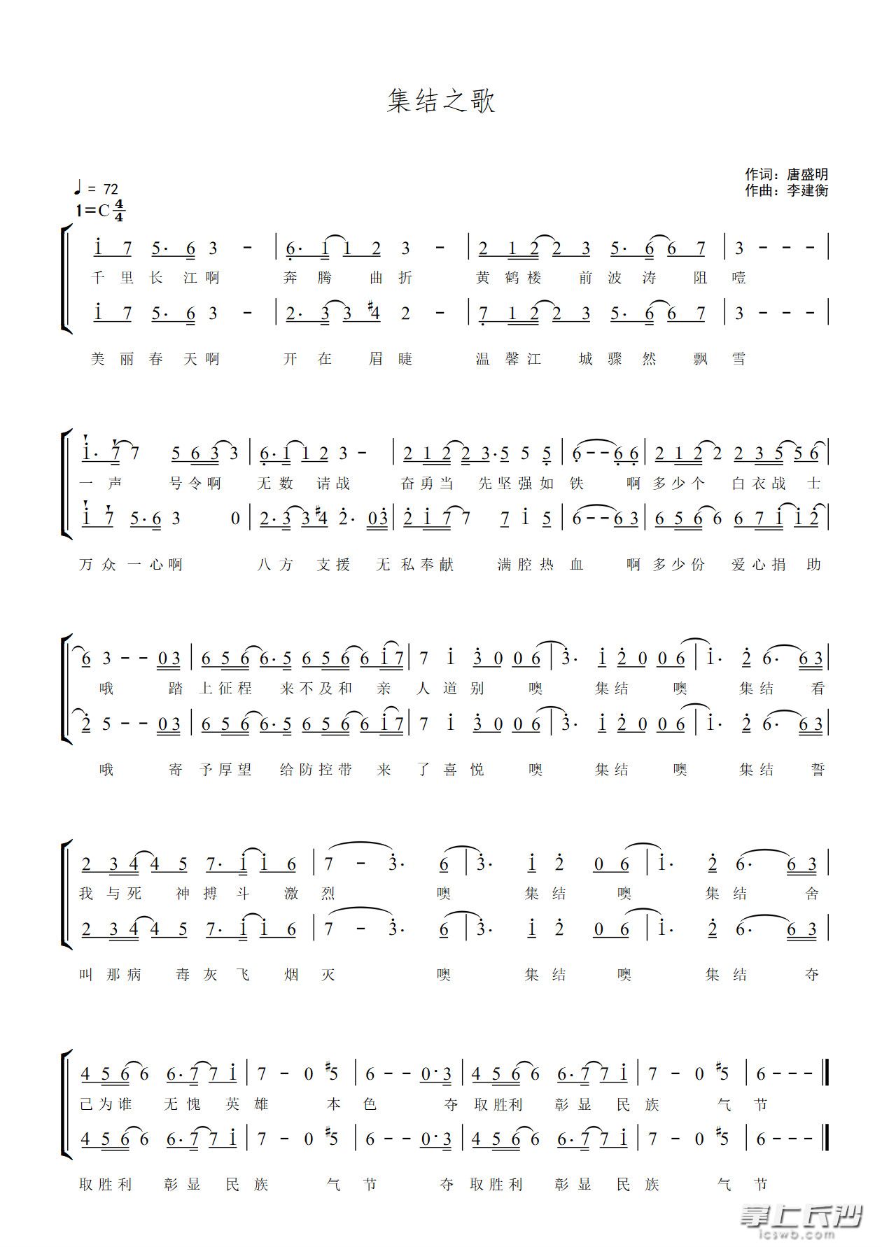 “千里长江啊,奔腾曲折;黄鹤楼前波涛阻噎。一声号令,无数请战……踏上征程,来不及和亲人道别,集结!集结!舍己为谁,无愧英雄本色”。集结,出发!奋战,坚守!