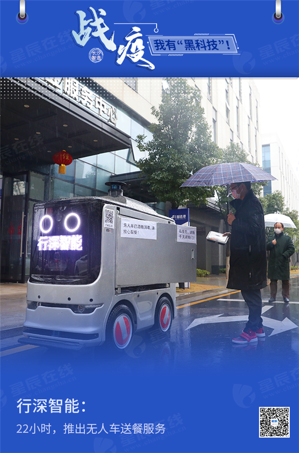 在长沙经开区的长沙科技新城园区内,暨无人快递车后,长沙行深智能科技有限公司仅用22小时,全新上线无人送餐车。为了减少接触几率,送餐无人车一律从触屏操作改为扫码操作,同时,车体改装为保温车体,确保送达的每一盒饭菜都是热乎乎的。另外,自正月初二起,该公司研发的无人投递车——“汉马”承担起湖北省仙桃市政府及直属单位区域内的投递任务。