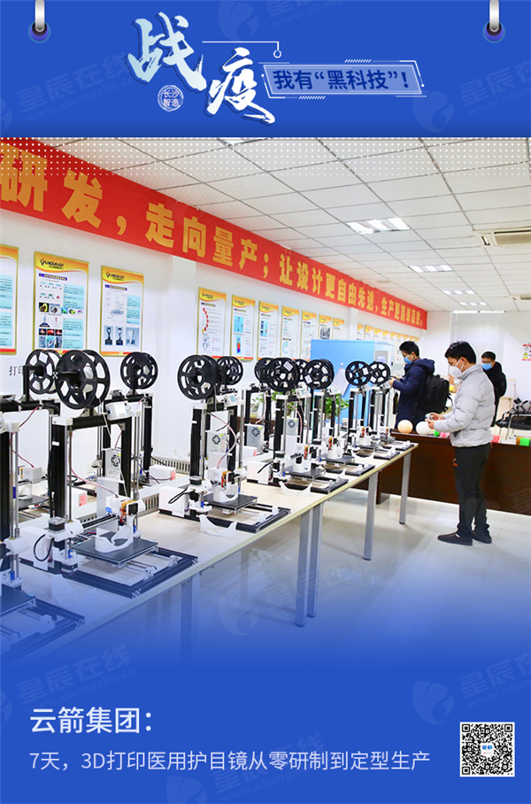 2月7日,湖南云箭公司首批FDM-1型医用护目镜,通过湖南省长沙市市场监督局备案准入。1月31日晚11点,云箭集团决定研制、支援医用护目镜产品。2月1日晚9点,第一件样品制作完成。为了确保研发生产的产品满足国家对医疗器械的相关要求,云箭集团工作人员用时153个小时近7天,一边学习消化国家标准,一边优化设计反复验证,最终完成了第一型产品的设计定型。2月10日,云箭集团第一批500套医用护目镜驰援抗疫一线。