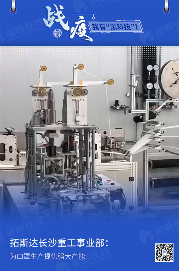 位于长沙经开区的广东拓斯达长沙重工事业部是一家专注于以工业机器人为代表的智能装备的研发、制造、销售,致力于成为系统集成+本体制造+软件开发+工业互联网四位一体的智能制造综合服务商。疫情爆发后,公司积极响应“战疫”要求,迅速研发出了全自动一拖二平面口罩机。该设备由一台主机(口罩成型机)加两台耳带焊接机(外耳带),通过一条一分二的传送线连线而成。设备仅需一名操作人员,可以实现从卷料上料、折叠压合成型及分切、耳带上料机焊接、下料的全自动生产过程。每小时产能约4千片口罩。