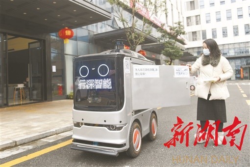 (2月12日,长沙经开区长沙科技新城,顾客从无人车内取出餐食。当天,长沙行深智能科技有限公司上线的无人送餐车为园区工人成功配送157份餐食,有效减少了送餐过程中的人员接触。湖南日报·新湖南客户端记者 辜鹏博 熊远帆 通讯员 黄姿 摄影报道)