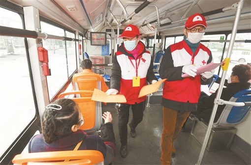 ▲2月13日,长沙火车站,交通集团湖南巴士志愿者在给公交车乘客宣传防疫知识。湖南日报记者 田超 通讯员 梁鑫裕 摄影报道