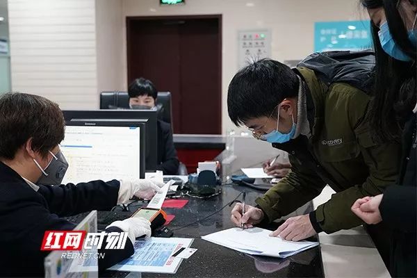 长沙市政务服务中心燃气缴费窗口,一位市民正在填写资料,窗口办事人员按要求佩戴口罩、手套等,严格执行防疫措施。