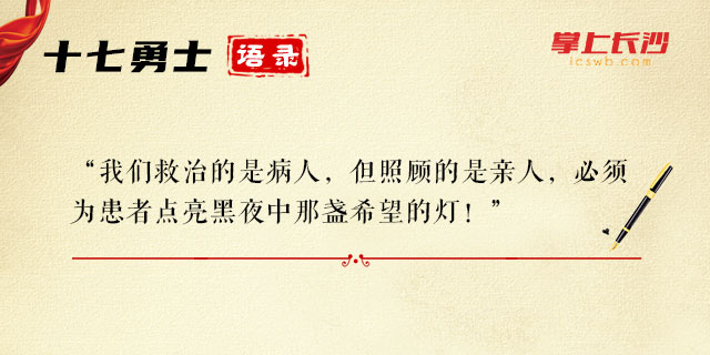 在长沙抗击新冠肺炎的战“疫”中,有17名白衣勇士,直面生死危情,率先扑向最危险的地方,走上没有硝烟的战场,他们用责任和担当、勇敢和智慧、仁爱和温暖,筑起了一道抗击疫魔的生命之墙。