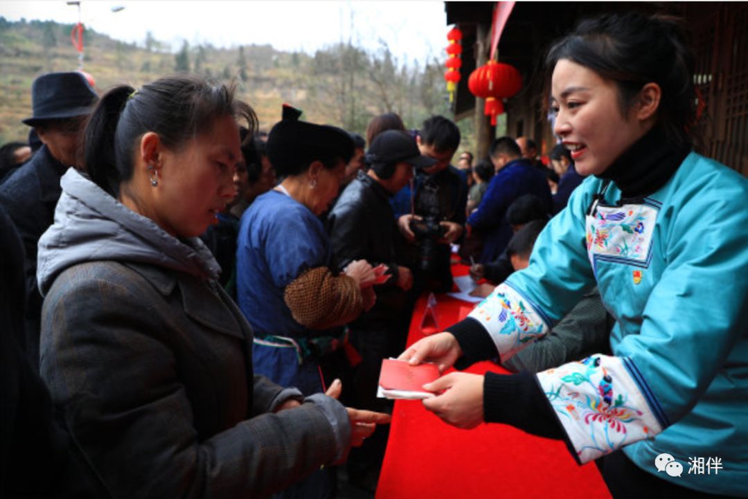 花垣县十八洞村,村民在领取村集体经济猕猴桃产业的收益分红。2014年,该村在精准扶贫中,动员全村村民入股种植猕猴桃1000余亩。 吴建斌 摄